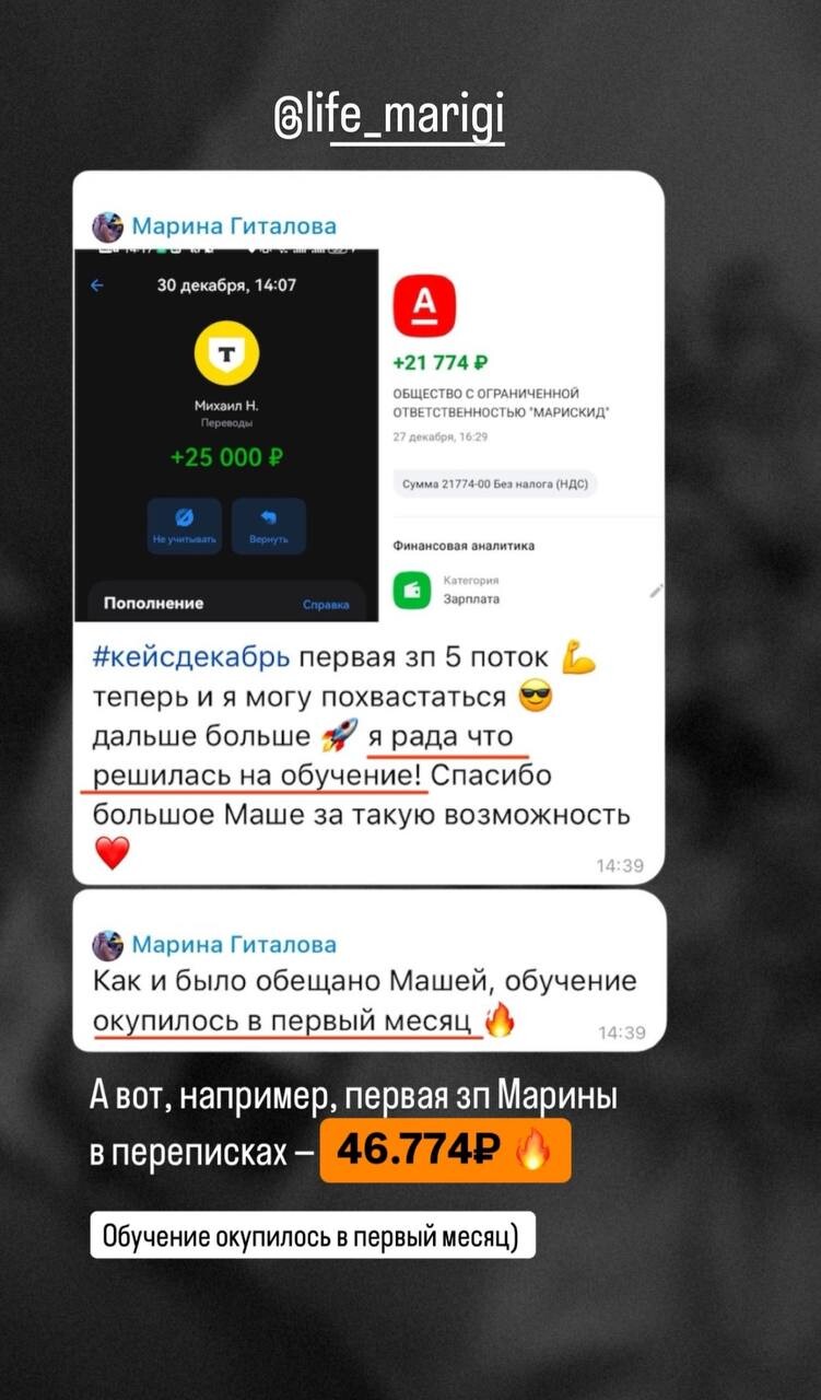 Работа с опытными кураторами, которые уже прошли обучение и вышли на доход выше 100к + практические домашние задания + общий созвон 1 раз в неделю с экспертом курса.